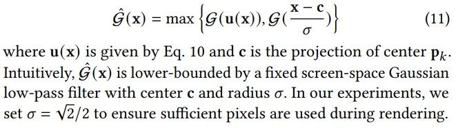 加一个 固定屏幕空间半径的低通高斯滤波 → 保证每个退化 splat 仍然有贡献 → 优化稳定