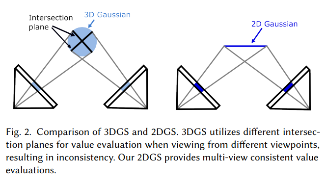 - Unlike 3DGS [Kerbl et al. 2023], which models the entire angular radiance in a blob, we simplify the 3-dimensional modeling by adopting “flat” 2D Gaussians embedded in 3D space.