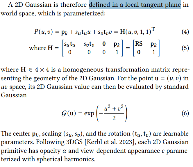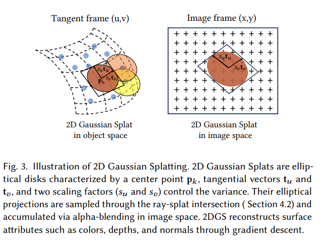 - With 2D Gaussian modeling, the primitive distributes densities within a planar disk, defining the normal as the direction of the steepest change of density. (法线垂直于2D盘)