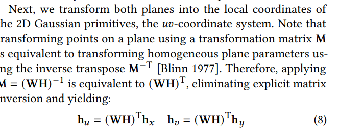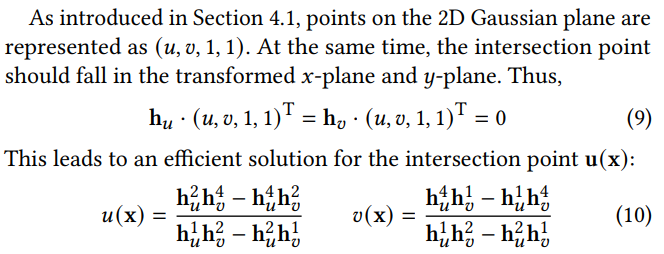 \[x = (xz, yz, z, z)^{\top} = W P(u,v) = W H(u, v, 1, 1)^{\top}.\]- x is ray emitted from the camera and passing through pixel (𝑥, 𝑦) and intersecting the splat at depth 𝑧.