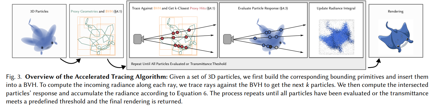 - The main idea is to construct encapsulating primitives around each particle, and insert them into a BVH to be rendered by a ray tracer specially adapted to the high density of overlapping particles.
