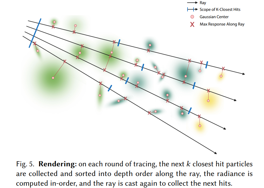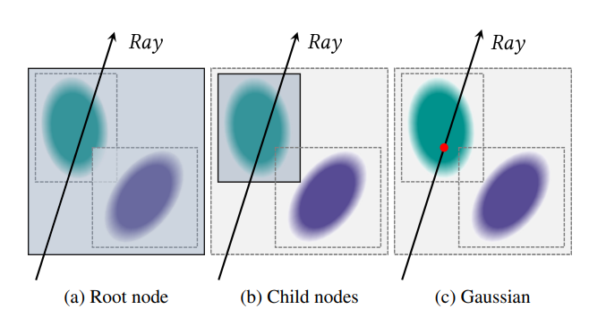 - 光线穿过场景 → 从根节点开始递归 →光线穿透半透明 Gaussian → 遇到叶节点累积 αj → 继续递归回到上层节点,遍历其他相交的叶节点