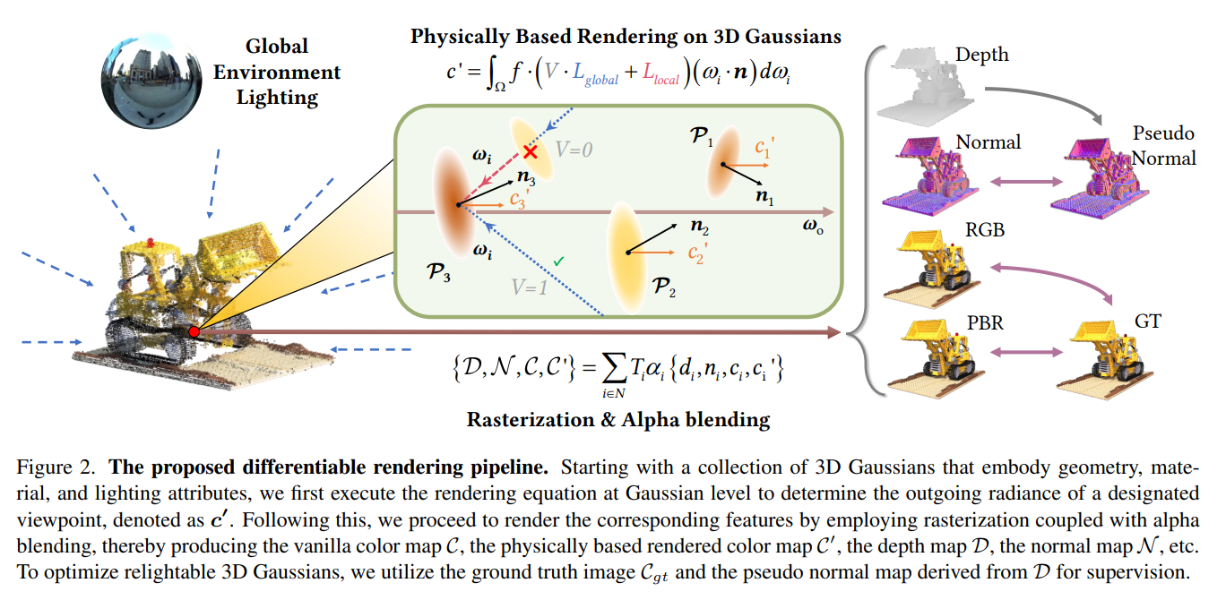 在3D Gaussian 层级上计算 PBR color,再通过 alpha-blending 渲染图像。