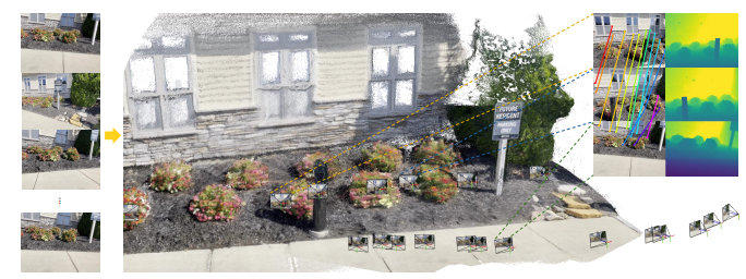 - The front end is a video depth estimator and camera pose initializer, adapted from typical monocular depth prediction frameworks with attention based temporal information encoding [VGGT]. The predicted video depths and camera poses are then fused through a scale-shift estimation module, which ensures consistency between the depth and motion predictions.
