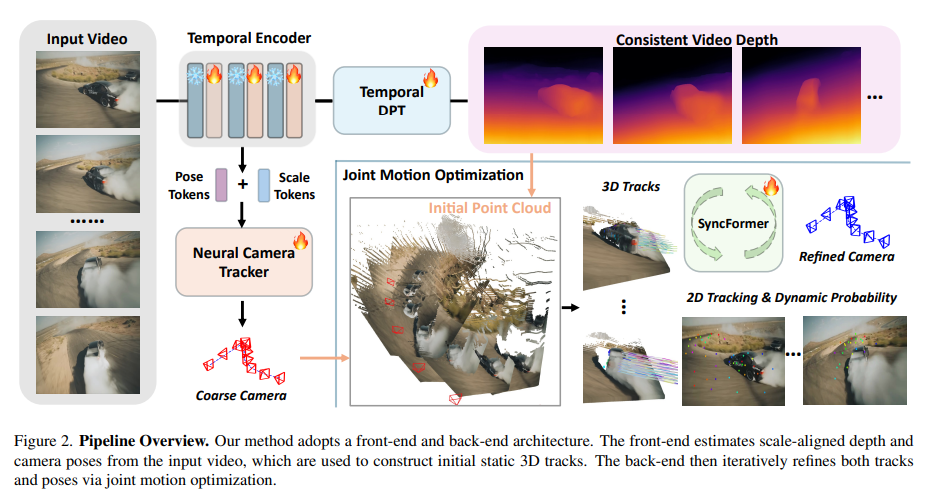 - The back end consists of a proposed Joint Motion Optimization Module, which takes the video depth and coarse camera trajectories as input and iteratively estimates 2D and 3D trajectories, along with trajectory-wise dynamics and visibility scores.
