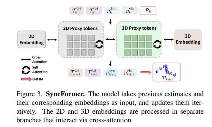 - takes 2D embeddings, 3D embeddings, and camera poses \(P_k\) as input