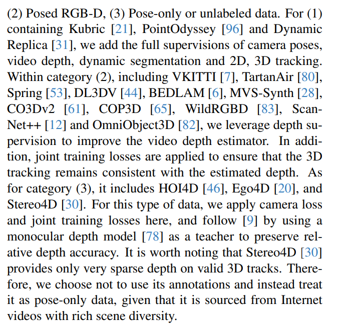 - leverage depth supervision to improve the video depth estimator. In addition, joint training losses are applied to ensure that the 3D tracking remains consistent with the estimated depth.